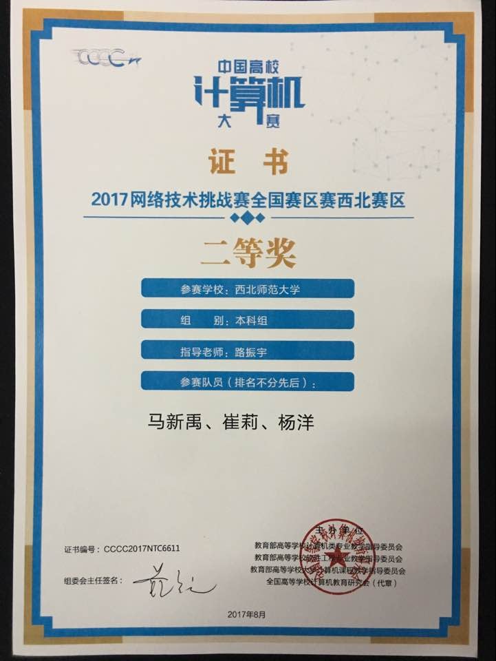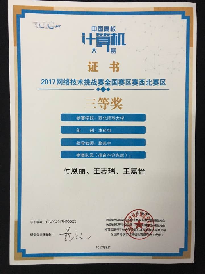 7月22日,中国高校计算机大赛-网络技术挑战赛(西北赛区)在西安邮电大学举行,西北师范大学取得优异成绩,有两支队伍分获西北赛区二等奖,三等奖。此次大赛由我院路振宇老师带队,经过校内淘汰赛,最终有五支队伍出线参加此次比赛。出线队伍在假期认真集训,比赛中发挥出色。其中,崔丽、杨洋、马新禹三位同学以赛区前十的优异成绩获得了二等奖;付恩丽、王嘉怡、王志瑞三位同学获得三等奖。